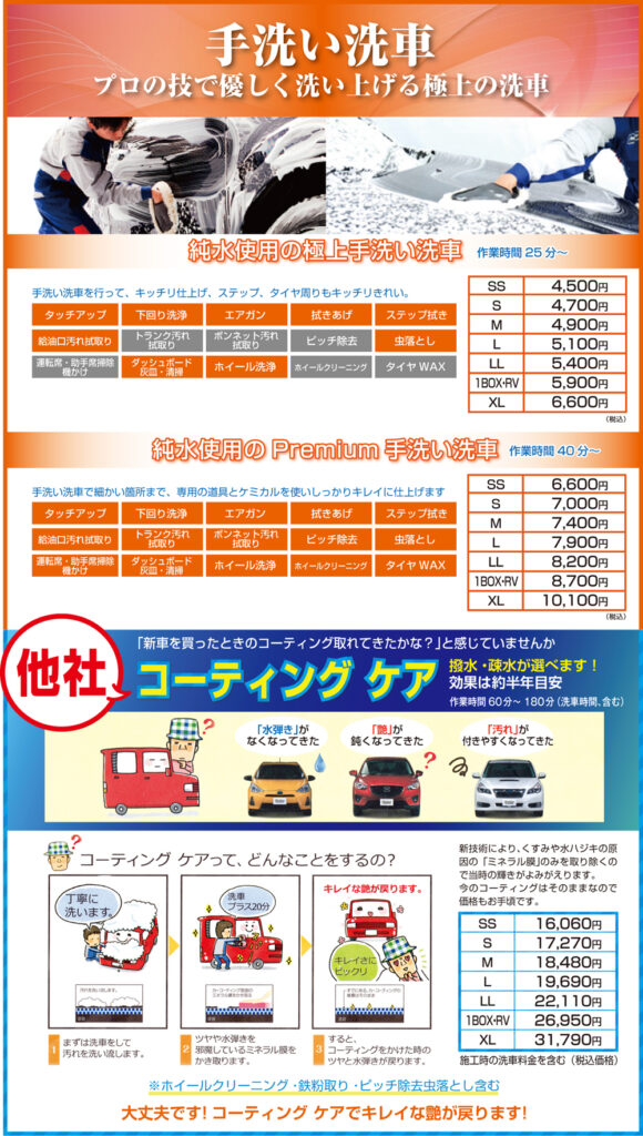 他社コーティング ケア・手洗い洗車 料金 メニュー表